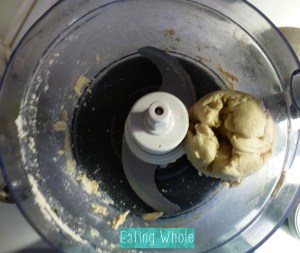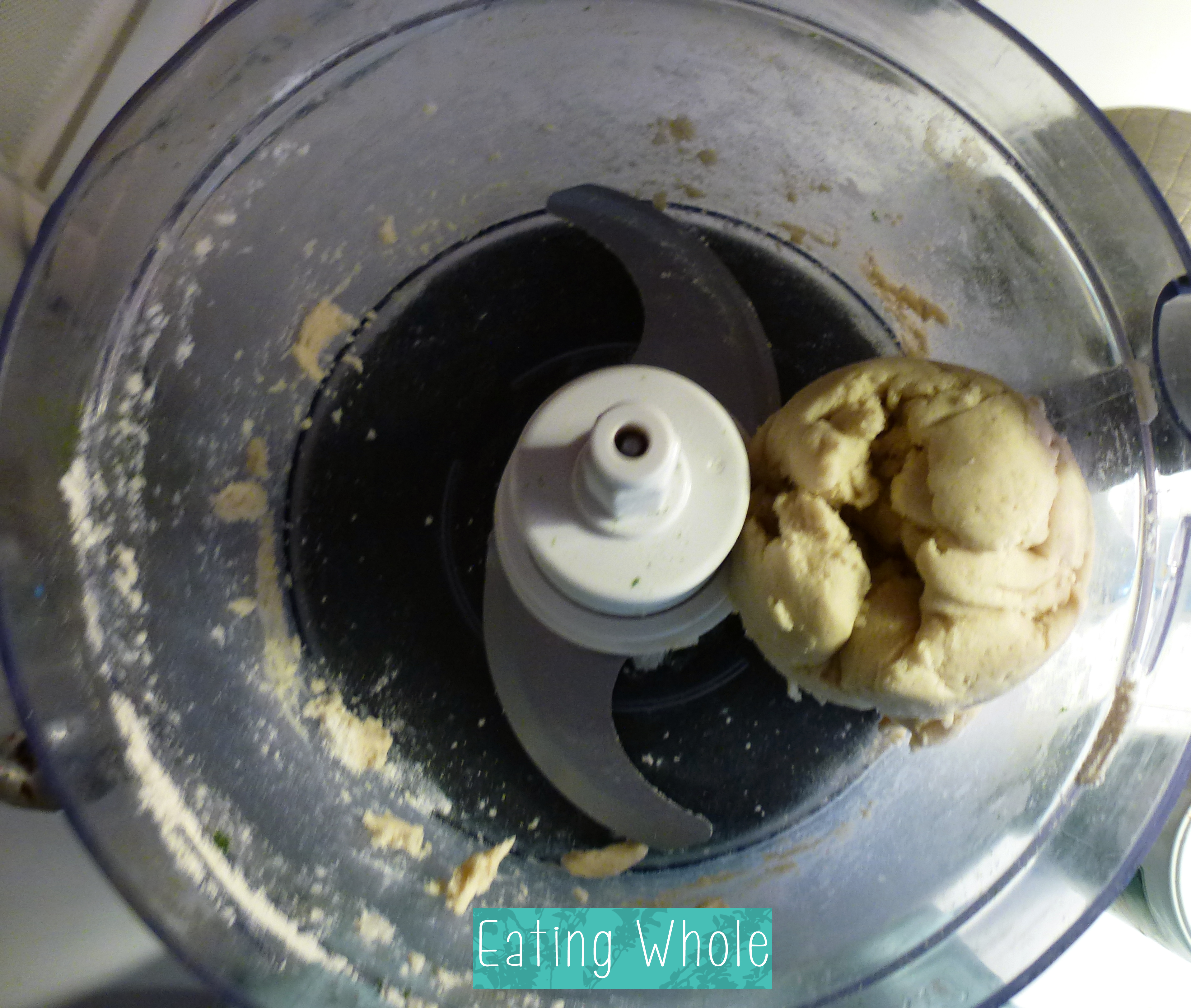 - Keep your processor on, and add your water, 1 Tablespoon at a time, until your dough starts to come together (be careful to not add too much water!) & forms a ball. Cover with plastic wrap and place in fridge.