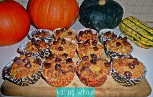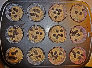 2. Add your batter to each muffin tin, filling almost to the top, and sprinkle the tops with chocolate chips, if using.  Bake for 20 minutes @ 400 degrees: