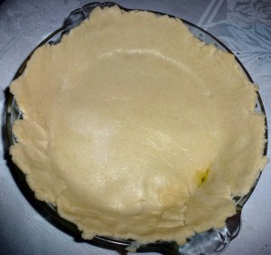 Carefully transfer your dough by removing the top layer of plastic, insert your hand under the bottom layer of plastic, and gently lift your dough and invert over your pre-greased pie dish. Repair edges if necessary (it’s okay if it doesn’t look perfect, it’ll still taste delicious!).