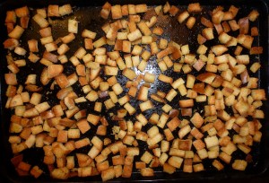- Preheat your oven to 350 degrees. On a baking sheet, spread your cubed bread evenly & toast for about 10-15 minutes until toasted, flipping your pieces half way through. (You may also use your toaster). Once your bread is toasted, set aside.